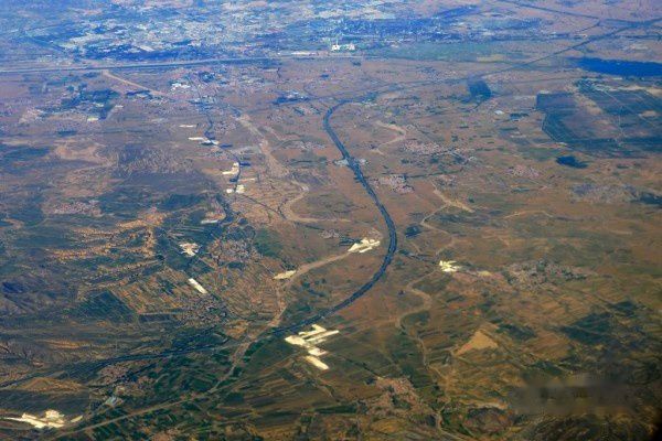 在飞机上看到的绿洲,山是干旱的,只在山谷里是绿色的,地形超级清楚。