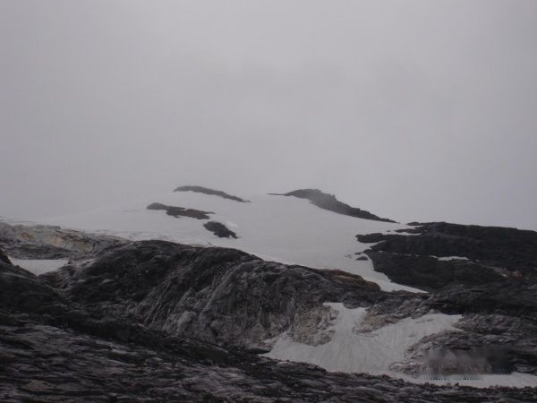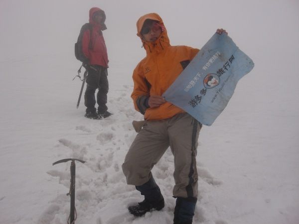 要上冰爪了,还要带上墨镜,可是我的墨镜被我坐坏了,掉了个镜片,此时身上和手套基本上被雨淋透了,手都红了,怎么也按不上那镜片,于是决定我睁只眼闭只眼往上爬.到了海拔5000米的时候,冰爪又坏了,奶奶的...两半了...此时,老周大哥似乎有点冻到了,看上去有点发抖,雨越下越大,向导又建议不要往上走了,老周大哥也有点动摇了,于是我们决定下撤,到雪线时见到了刚从下面上来的湖北大哥,此时,他已经抖的比较厉害了,嘴唇都有点发紫了...于是和我们一起下去了...