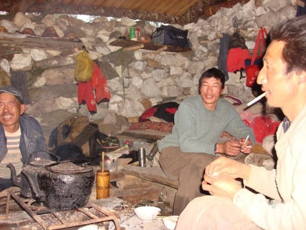 到了3000米左右的一个牧场时,开始下雨,我们在牧民的木屋里躲雨,顺便吃午餐.马黄(我们的一个向导)还给我烤了个蘑菇吃,没加盐,没味道.嘿嘿.