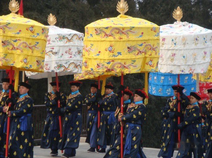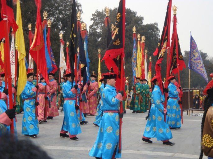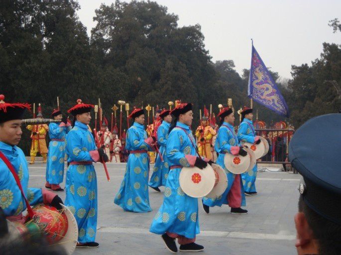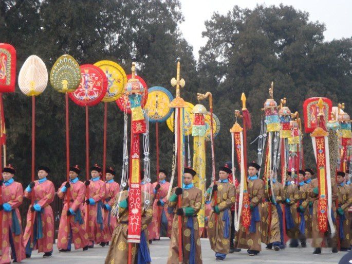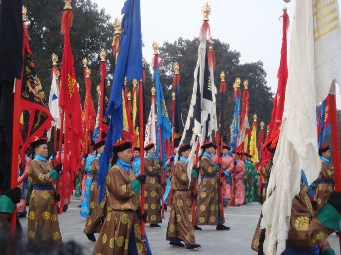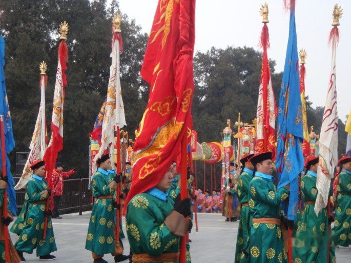 北京天坛是世界上现存最大的祭天建筑群,是明、清两朝皇帝举行祭天大典的场所,历史上共有二十二位皇帝先后在此举行过六百五十四次祭天盛典。今年第九届天坛文化周祭天仪仗和祭天乐舞表演依照清乾隆十三年的《大驾卤簿图》和古代舞谱的记载,艺术地再现中国古代祭天情景。