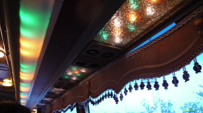在济州全程坐的是空调旅游大巴,巴士的内部装潢很特别,特别在晚上开了灯的时候特别漂亮。