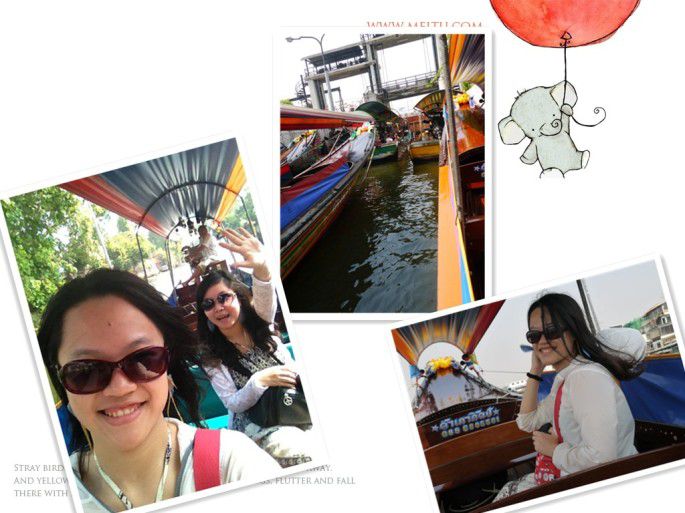 到了大皇宫,附近一堆游行的人,真是热闹~这里有的说了,我们正看着地图找路,有个好心的人来问我们是不是要去大皇宫,然后跟我们说现在暂时不开(那时中午11点左右)说是泰国人民朝拜的时间要等到12点以后才开,建议我们先去游河,一个小时左右,还有水上集市什么的,他帮我们叫了辆车说帮我们买泰国人的票才900B!因为之前在路上听到一个TUTU司机也这么说所以我们就去了!然后呢,所谓的河就是一条又脏又臭的水沟,所谓集市就是一个划着小船的人来问你要不要买东西(我都怀疑那个小船买东西的是他们一伙儿的)。。。花了我们1800B啊,心痛!(后怕啊,还好只是骗了钱,没有危及生命有木有~)之前泰国人朴实热情的形象全被他毁了(除了这群骗子普通人民还是很好的啦~)游都游了照两张相呗!