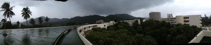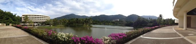 带着朦胧的细雨,我们23:30到达普吉希尔顿酒店,从酒店正门到大堂是要乘酒店的小巴士(后来发现几乎大一点的酒店都要有自己的穿梭巴士,人少地多吧!)。映着夜色,泛绿的泳池隐藏在暗树中,别有一翻韵味;