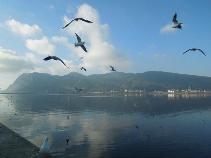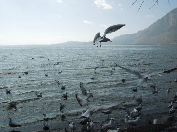 海鸥隔着草海所以一点也不在意会惊扰睡美人(当地人对西山的爱称)