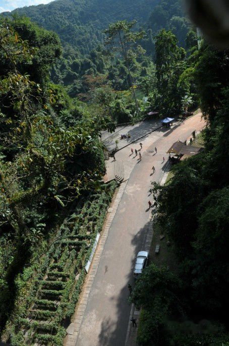 - 我们上午离开曼旦到勐腊,坐班车不到一小时,到望天树景区,沿途看日头高高的很烈,正担心羽绒服穿多了,进到景区满目葱茏,凉意扑面而来。望天树景区入口处广场建在山谷口,两边高高的树木,近处宽阔的石阶一路向上,石阶的两侧建有层层花坛,赤橙黄绿,缤纷斑斓,水顺着花阶潺潺而下。树形花色水声,因沿了山坡而显得很有气势。