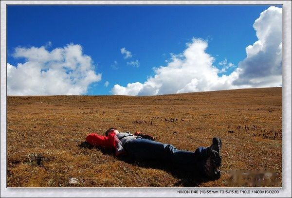 我知道我们已经到了理塘境内了,而这就是毛娅大草原。只见黄色的草在阳光的照耀下闪着淡淡的金色光芒,这金色慢慢的蔓延开来与远处如兰色绸缎般的天空连到了一起,而在这闪亮的纯净的蓝缎子上还点缀着形态各异的白色花朵生动而洁白,那就是朵朵漂浮的白云。多么美丽的一副色彩斑斓的巨大画卷啊。 发现语言已经无法形容这样的美丽,于是只能拿起相机一阵狂拍,遗憾的发现照片也只能体现那美丽,却无法体现那样的广袤。于是我静静的躺在那草地上,感受暖暖的阳光照在身上,远处神鸟飞过,棉花糖般的云朵好象伸手就能抓到,那一刻感觉自己是悬在半空,如果能这样一直躺也是种莫大的幸福啊!想到理塘的藏文意思平坦如铜镜似的草原,不得不承认藏民他们这个形容的贴切,如今我所躺的这片草原是那样的平坦,像是打磨过的铜镜,而点缀在草原上的那些小花就像那铜镜的雕花般在这镜上蔓延着,而这一大铜镜闪着属于自己的小光芒,平和而宁静。在同伴的一再催促下离开了这铜镜的怀抱,向着理塘县城前进。