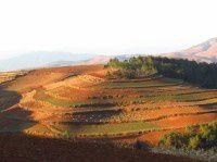 第三天,离开武定后,沿108国道来到禄劝县,按地图所指左转向北,驶向东川红土地。在绕过绵延不断的山路后,过倘甸县城,于中午时分终于到了红土地。为了拍到更好的照片,我们找了一家叫红土地摄影宾馆的住下 。当天天气特好,填空没有一丝云彩,一下午,大家在院坝晒足了太阳,快6点的时候赶快拿着器材出去拍摄夕阳下的红土地。次日一早天不亮,大家起床拍过日出。