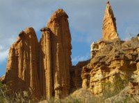第二天早饭后,按计划继续沿G5高速向元谋土林进发。进入云南境内,过永仁不久,便到了土林出口。对元谋土林感兴趣是因为张艺谋的电影《千里走单骑》,里面有一个由日本演员高仓健饰演的主角带着孩子在土林迷路的情节就是在那里拍的。还有就是读中学学《社会发展简史》学到的人类祖先—元谋人。出收费站后,在一个岔路口我们向标明物茂土林(老土林)的方向驶去。物茂土林的门票是80元,若要和新土林的门票一起购买的话,套票是100元。根据行程的安排,我们只购买了单票。土林的风格和石林差不多,在雨水和风的切割下,形成各种地貌,只不过一个是岩石一个是沙土,但你也不得不感叹大自然的鬼斧神功。给我们留下更多印象的是天气—干燥、炎热、风 。
