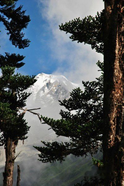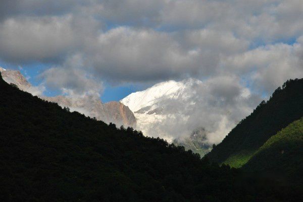 突然,眼前被一团亮白的东西晃了一下,定眼一看,天啊,在遮顶乌云和暗黑的山脊之间的缝隙处,一座洁白的雪山矗立在那儿,身披金色的阳光,而映衬它的竟是一片蔚蓝的天空!知道心花怒放是怎样的吗?就是我此刻的心情。
