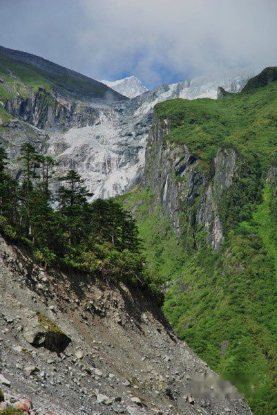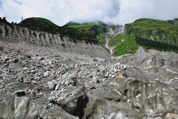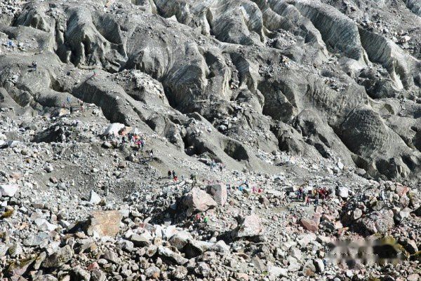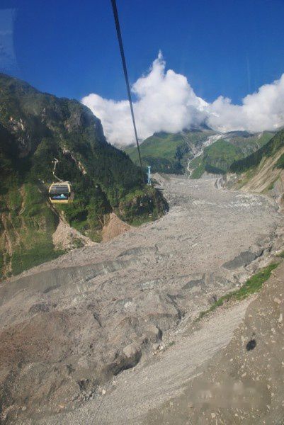 索道凌空飞越冰川,一条巨大的泥石流从山谷间奔腾而下,夏季冰川其实就是这副摸样,不过,布满冰川的裂隙间发出的森森寒光时时提醒着你它的真实身份。