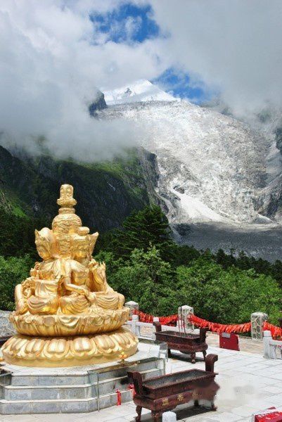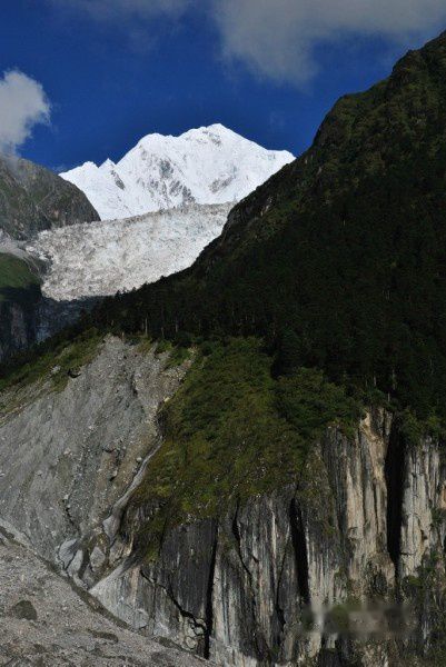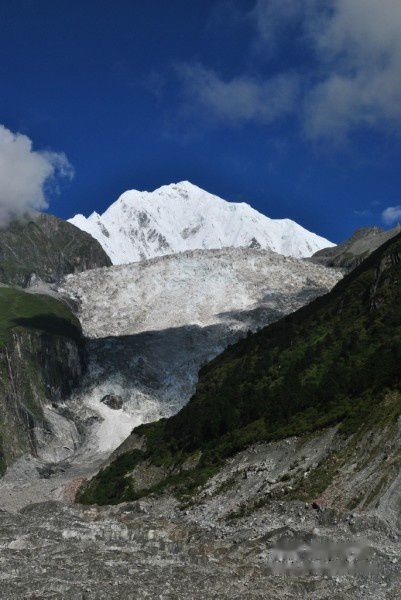 随着缆车不断升高和角度的变化,贡嘎主峰更加清晰而完整地展现在我的面前。蜀山之王以磅礴之势尽显王者之风,凛然不可侵犯。那瓦蓝瓦蓝的天宇仿佛就是它的宫殿,四周群山恰如它的臣民,那高大敦厚的千米冰瀑完全成为它的宝座,贡嘎,就以这样完美的姿态接受了我的朝拜!