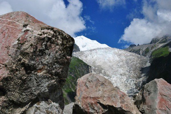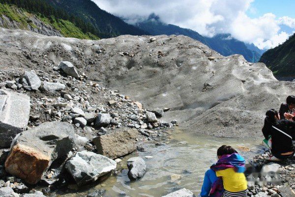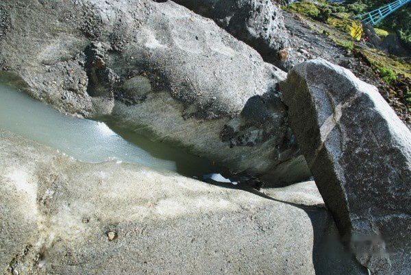 站在冰川上环顾周遭,贡嘎主峰巍峨耸立,在它脚下是一道近千米厚的冰瀑;顺山谷而下,便是我们脚下的长达十几公里的冰川。别看它灰不溜秋,工作人员讲,它也有300余米厚。看看山谷两边被冰川刨蚀而裸露的山体以及冰川裹挟的巨石,你就不会怀疑它的力量和强大了。
