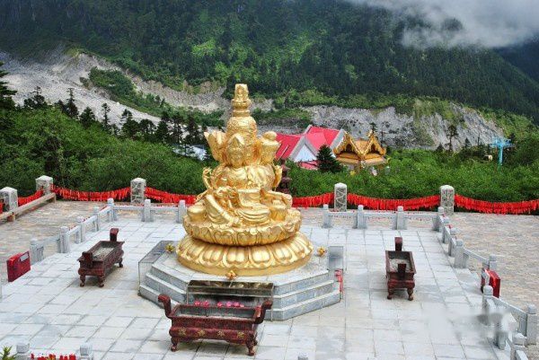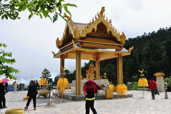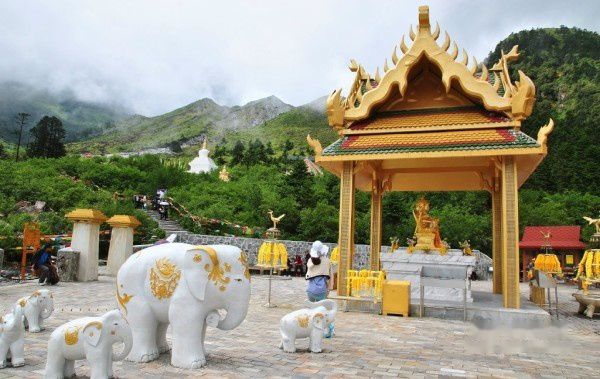 走不一会,登上一平台,眼前赫然出现一座泰式佛阁,另有几只大大小小的白象雕塑。这突兀出现的纯泰式四面佛和佛器,让我一时之间有些回不过神来。原来,这真是泰国佛教界在贡嘎神山上供奉的四面佛。细一看,与远处山坡上的藏传佛教白塔遥相呼应,竟也相映成趣,表达的都是人心的虔诚与敬畏!