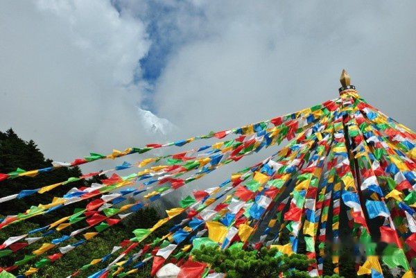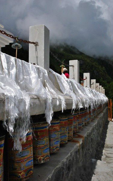 再往上,已是海拔4000米左右高度。就在这里,藏人供奉的金佛端坐在贡嘎山下,俯瞰着芸芸众生;金顶白塔旁,风马旗和经幡随风将佛陀的护佑带到四方;转经筒边自有喇嘛在守护,经筒旁满是人们献上的洁白哈达。上山的路旁,随处可见藏人垒起的玛尼堆,以及刻有真言的玛尼石,藏人对信仰的虔诚可见一斑。