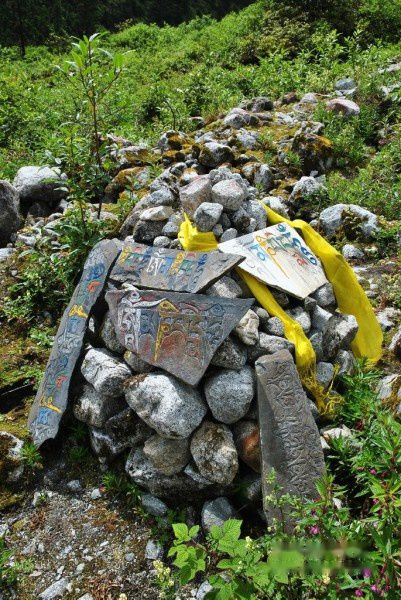在白塔上方,高高竖立着一处五颜六色的经幡。风马旗在山风的吹拂下咧咧招展。不远处,一座不锈钢制成的纪念碑正默默陪伴着逝去的登山勇士们。再往上,一块介绍贡嘎红石滩的木牌指引我们继续向上攀爬。