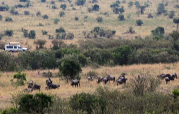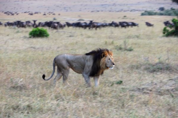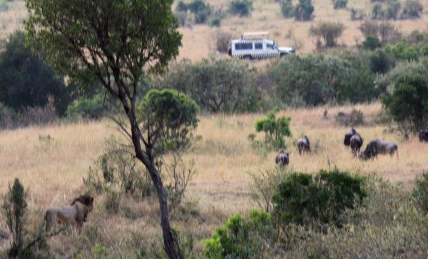 那天近黄昏时分,狩猎的车辆纷纷往马赛马拉公园的大门口方向运行(所有狩猎车辆必须在每天6点半前离园)。只见前面有十几辆车停在路上,我们也紧赶过去。就看到这只刚刚睡醒的雄狮,越过停满车辆的道路。向对面的角马群靠近。