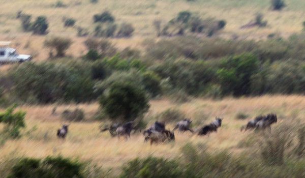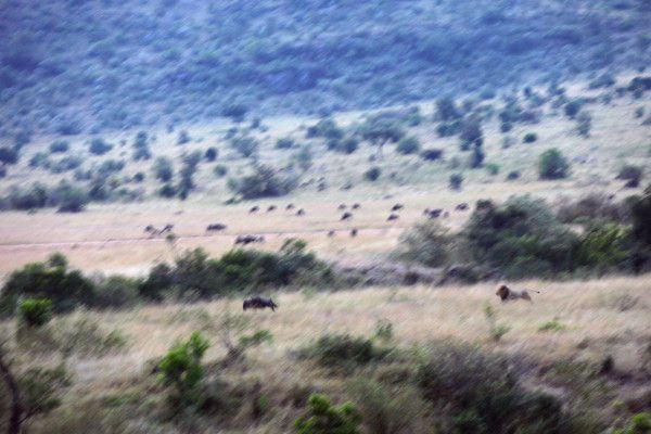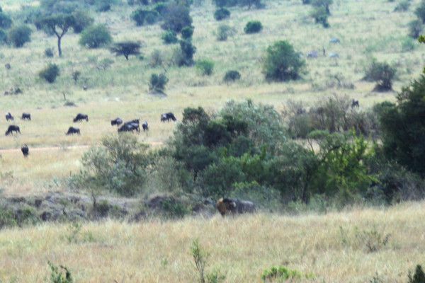 雄狮已经逼近角马群,迟钝的角马还没有发现狮子(狮子在左下方)。