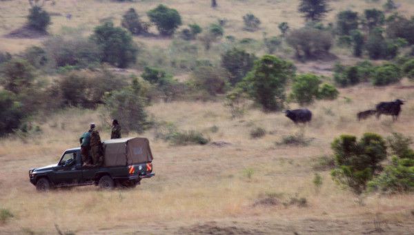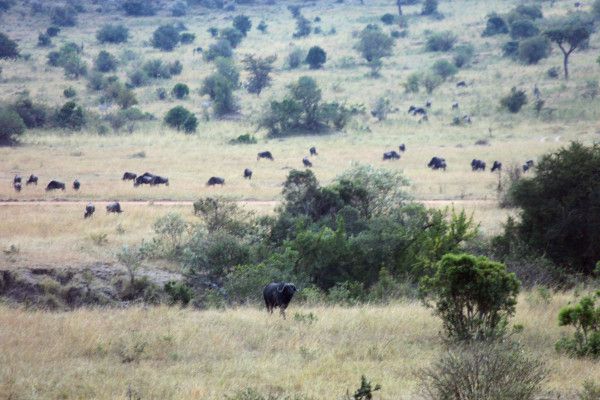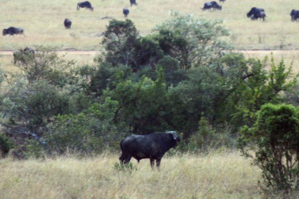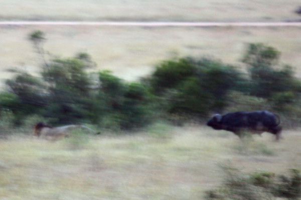 右边一头水牛,一直注视着刚才的一幕。突然,它低着头朝执勤车方向冲过来,开始我们都不清楚它的意图。后见它冲过执勤车,直向狮子奔去。它去干什么?正在疑惑中,就看见狮子放弃了角马,落荒而逃。