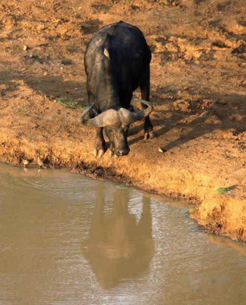 别看水牛健硕强壮,也是好奇的动物。它一直盯水中的影子愣神儿。