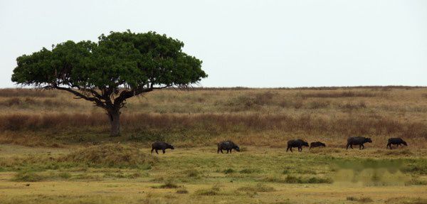 非洲水牛虽是食草动物,但性情急躁、个性凶猛,对于人类来说,其危险性不低于狮子。司机小宋就告诉我们要远离水牛,它发起脾气来会推翻狩猎车辆。