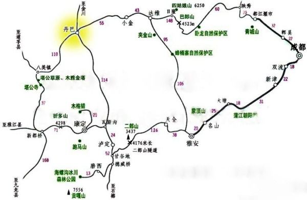成都至丹巴道路概况: 第一条线路(约365公里):成都-都江堰-映秀-卧龙-小金县-丹巴(本次选定的路线)第二条线路(约451公里):成都-天全县-泸定县-姑咱镇(瓦丹路)-丹巴 第三条线路(约443公里):成都-宝兴县(夹金山)-达维-小金县-丹巴 第四条线路(约578公里):成都-绵阳-九寨沟-黄龙-马尔康-金川-丹巴 第五条线路 (约579公里):成都-天全县-泸定县-康定县城-新都桥-丹巴