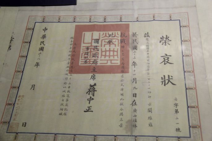 由蒋中正签发,国民政府颁发给阚维雍将军的荣哀状,国家一级文物。阚维雍1944年11月15日在桂林保卫战中殉职,国民政府追认为陆军中将。