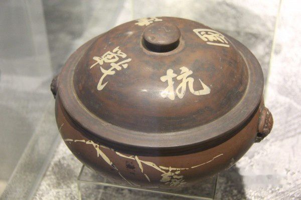 “抗战建国”紫砂陶汽锅。建水紫砂陶是云南名品。