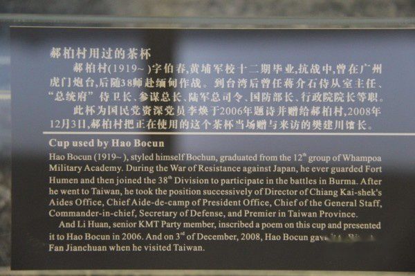 历任台湾参谋总长、陆军总司令、国防部长、行政院院长郝柏村用过的茶杯。
