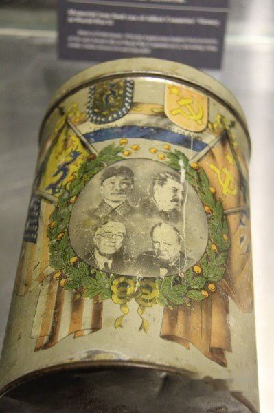 纪念二战盟国胜利的铁食品桶,荷兰制造。上有当时反法西斯同盟四个主要国家的领导人的头像:蒋介石、斯大林、罗斯福、丘吉尔。