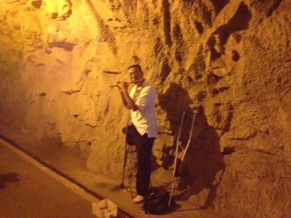 穿过鼓声洞时洞里一个残疾人单立一条腿在吹笛。悠扬的笛声韵味深长。站着听了一会给了些钱。虽不知人家吹的是什么曲子,可我总认为音乐不需懂得,只要你与它在同一频率就能产生共鸣。
