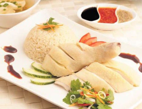 鸡饭的主料是鸡和大米,最好的鸡饭选用的作料是“文昌鸡”。由于“文昌鸡”供不应求,一般鸡饭摊档选用本地杂色鸡,要求是刚成熟而尚未下蛋的鸡,以1至1.5公斤重为宜。大米选用上等新鲜的优质米,鸡是白切鸡。鸡饭皮色油黄,肉白且嫩,骨髓带血,吃来清甜爽口。 这种米饭,油润软滑,香浓味爽。