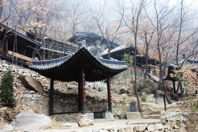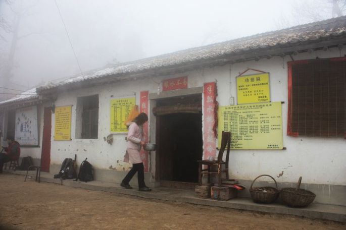 继续沿铺满松软落叶的山路上行,约11点,我们就来到了海拔1670米的青华山中的卧佛寺,寺内有著名的“五层楼”:一层——卧佛洞,二层——济公洞,三层——五佛洞,四层——吕祖洞,五层——西佛洞,可惜这一切被此时越来越浓的大雾完全笼罩了。