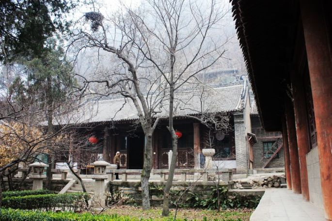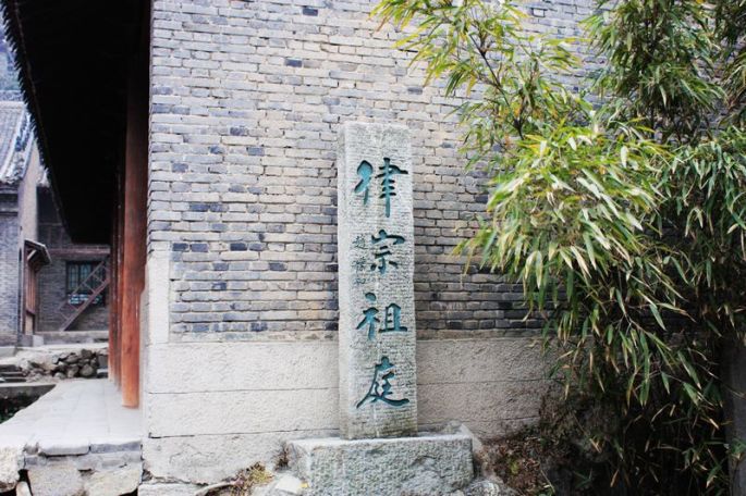 冬季的山寺,虽树木凋零,落叶满地,却丝毫没有给我凄清、冷寂的感觉,我反而觉得山寺就应该这样:清幽、静寂、空阔、高远。佛教自印度传入中国后,形成了八大宗派,它们当中有六个宗派的祖庭在西安,净业寺便是其中之一的律宗的祖庭。进得位于山腰的寺院,在园中一角,一笼绿竹之下,立一石碑,上面便是赵朴初题写的“律宗祖庭”几个大字。