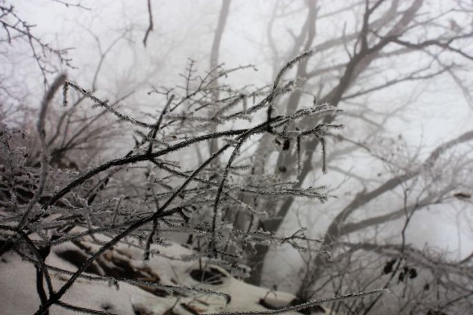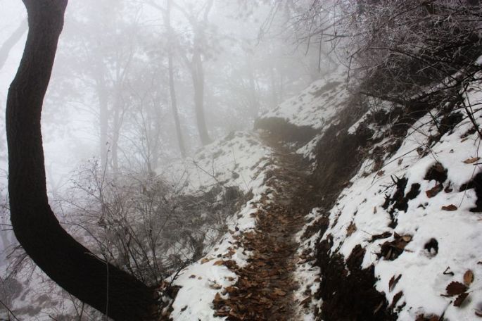 没想到这里还有一农家乐,我在他家吃了碗油泼面,稍事休息后,继续前行。之后的路程,几乎都是在雾中穿行了,有些地方还有积雪,路边的树枝上结起了冰挂,形成了雾松,除了眼前的山路,此外什么也看不清,正是:大雾锁秦岭,一片白茫都不见!