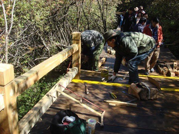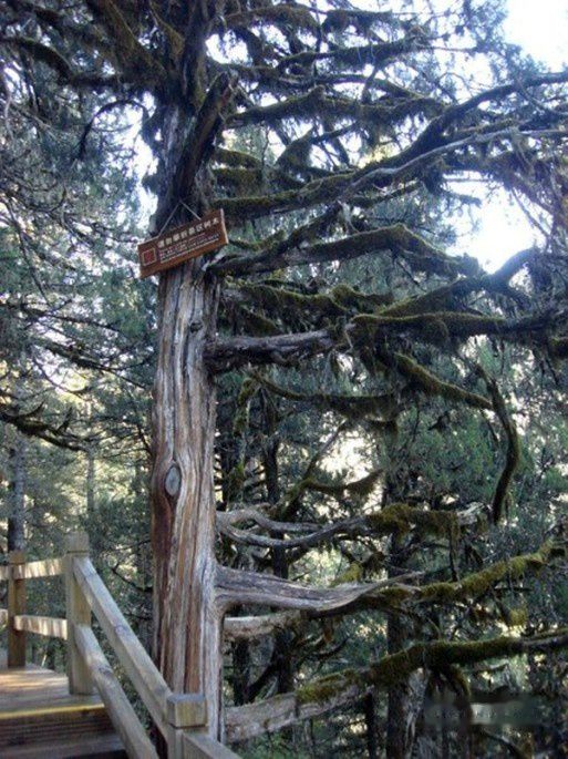 粗壮挺拔的大树比比皆是,修栈道则就地取材了!