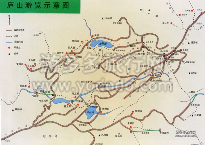 一线游:牯岭街——飞来石——如琴湖——花径——天桥——锦绣谷——仙人洞——御碑亭——圆佛殿——天池塔——大天池——龙首崖——悬索桥——石门涧(下山的路,需来回,比较花时间,适合喜欢登山的朋友)——电站大坝——乌龙潭——黄龙潭——黄龙寺——三宝树——芦林湖——庐山会址——毛泽东故居——别墅区——美庐别墅——“庐山恋”电影院——牯岭镇