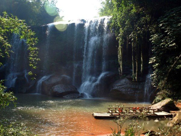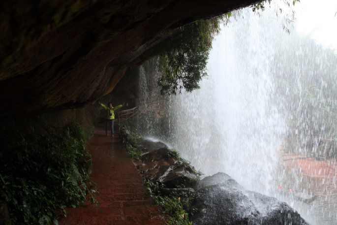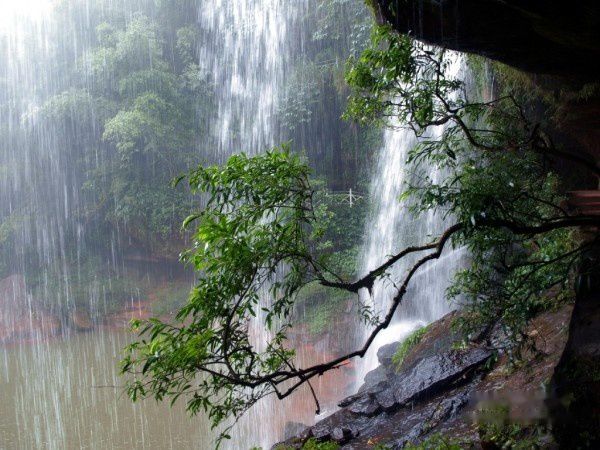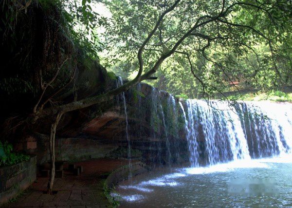 过古道桥,穿翠竹,走曲径约1公里,第一个迎接的就是水帘洞瀑布。天然石穴藏于瀑后,一条石径从瀑后穿穴而过,形成奇妙的“水帘洞”景观。哗哗的流水声河瀑水坠落撞击岩石的轰鸣声,会让你热血沸腾,心跳轰鸣。而“洞中盆景”更使瀑后景观更加奇妙。与黄果树大瀑布相比,逊气势,胜精致与灵气。呵呵,我笑称黄果树瀑布为“傻大姐”了。