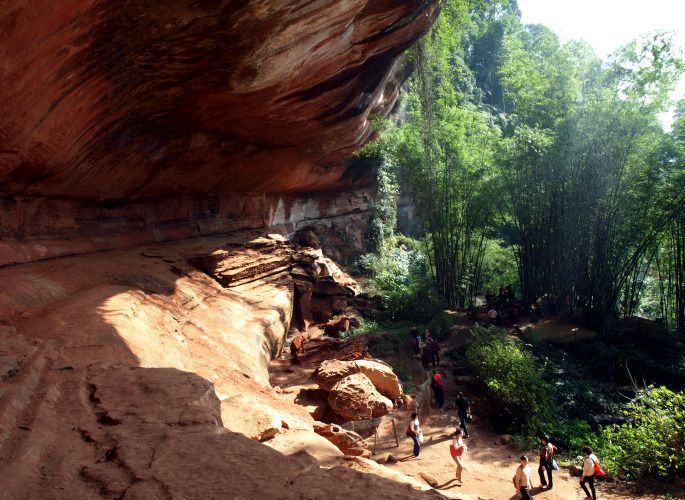 赤水杨家岩丹霞崖壁的不同之处,个人认为有两点:首先,它红似火,似夕阳。艳得让人似乎觉得要被点燃,让人热血沸腾。其次,别的地方多是绿树配红崖,这里是翠竹伴丹岩,红得艳,绿得鲜,大红大绿,相互抬衬,色彩鲜活得惹眼,刚阳之中透着些许秀气。俗话说,红配绿,丑的哭。而在这里成了绝配。见到它的第一感觉就是惊艳。