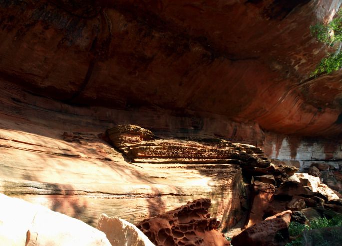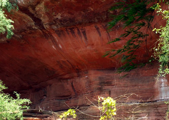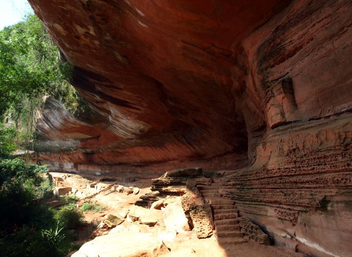 一面赤红的丹霞崖壁,石壁中间有一条横向切痕,是流水切割,风化剥落的结果,这巨大天然石廊就像一幅色彩浓烈的长画卷。穴中绝壁上又大量天然蜂窝状、水纹状饰痕,整个穴壁色泽红艳,间插着斑驳陆离铁青色苔迹,更显出岩穴的古老与美艳。具有很高的科考价值和旅游观赏价值,成了很多赤水旅游宣传画册里的招牌图片。