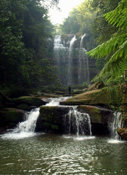 再行1公里,远远听见水的轰鸣声,继而四洞瀑布——“飞龙瀑”滁县在眼前,如白龙飞下,水雾弥漫,气势雄伟,动人心魄!白龙潭瀑布呈几级叠水,造型很美,让眼前一亮 。瀑水溅落与底下岩石撞击迸出的跌水水珠和喷出的雾气拒游人近前拍照。恐怕在丰水季节,这条“白龙”更会“拒人千里”之外吧。