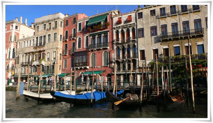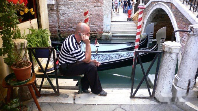 上得船来,方领悟,泛舟威尼斯的浪漫,在于你得完全忽略河水,不,海水,散发出来的咸腥味,方能陶醉在诗情画意的氛围。船,悠悠地驶过,夹在水巷里满是华丽的楼房,那些造在水上的繁华和锦绣,被岁月风尘,弄得又旧又黑的,墙泥片片剥落,露出橙红色的砖头。底层泡在水里,墙根满是青苔,看上去像废墟,楼上的窗棂边却开着花,还有雅致的临水小店,废墟斑驳在绚烂里,有一种怀旧的生机勃勃的美。