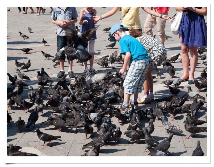 无数的游客用玉米粒或是面包喂成千上万只鸽子,像稻草人一样支着手臂,面带微笑,只等鸽子飞来吃时,好按下快门,拍几张“人鸟同乐图”。我没有那样的耐性,也怕鸽子屎中招,于是上演徒手诱鸽的戏码,很明显,姐的魅力远不及玉米粒。
