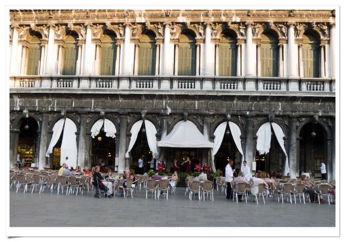 圣马可广场,这个被拿破仑钦点的“欧洲最美大客厅”则是看戏的绝佳场所。总督宫门前的露天咖啡座,放满了咖啡桌椅,椅子都是向外面排开,俨然露天电影院的架势。坐在那里,可以享受威尼斯最有名的古老广场,欧洲最迷人的意大利阳光,全世界最正宗的卡布奇诺咖啡,还有最销魂的乐队伴奏。