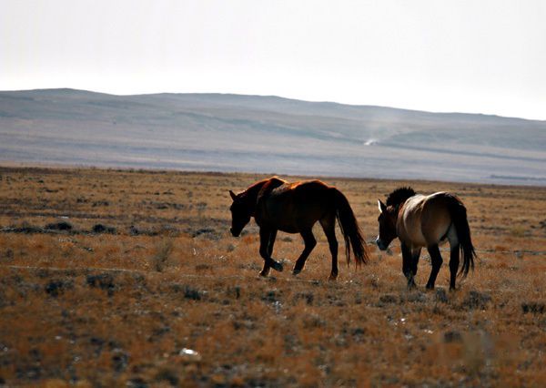 上路没多久,可悲的事情发生了。这辆33座、只座22人的的金龙大客车在前不着村、后不着店的戈壁滩上闹起了摆工,司机怎么也修不好,只能打电话换一辆,前后浪费了2个半小时,五彩城已无法游览,只能放弃,悲剧啊。有同伴打趣道:老天爷提抗议了,你们拍到了那么漂亮的日出,休息一下,五彩城就别去,也只能这样了。下一个目的地——古海温泉渡假村。下午4:35左右途经卡拉麦里有蹄类动物自然保护区,运气还不错,看到了普氏野马。