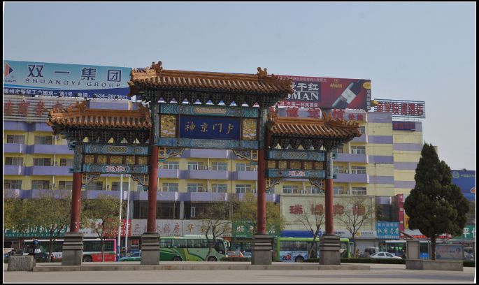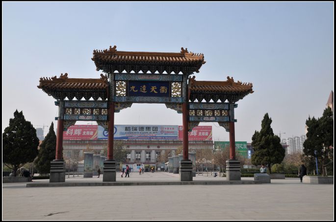 火车站前的“九达天衢”坊,其原型为明代石坊,题款为明嘉靖大奸臣严嵩所书。现在的牌坊疑似砖混结构,另一面题字“神京门户”。