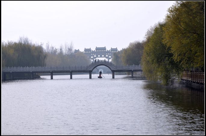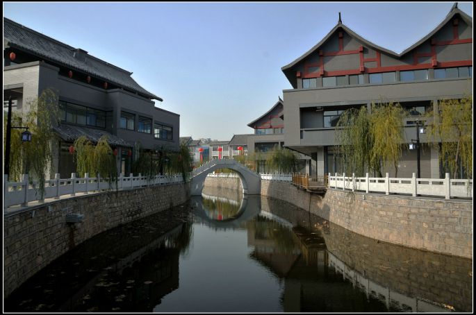 董子读书台景区蛮漂亮的,值得表扬。静静的河水,小巧的石桥,岸边有几座头上长角的石鱼,口内含着喷水管朝向河里张着大嘴。远处的石拱桥,几位友人在欣赏着景色,桥下一位清理河道的工人在作业。