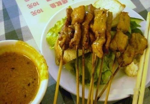 8RMB一份面包加8串肉串,一份面包里还包括几片生菜叶,最主要的是那里的沙茶蘸酱非常美味,一点也不觉得腻。这里的烤肉明显是用咖喱泡过才烤的,所以有咖喱香。老板烤肉的技术是很地道的,咬下去那是相当地多汁。吃之前沾上浓浓的沙茶酱甜甜的,辣辣的,还有一些烟熏的味道,真是别有一番风味。