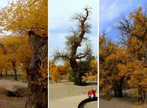我们终于穿越了这个天堂和地狱之间的地方——额济纳,现在想来确是此行无悔,今生值得去的地方,一定要去的地方!要想观赏额济纳胡杨,每年只有短短十几天的邂逅,去早了,胡杨没有千姿百色的绚丽,晚了,一夜寒流劲风就把胡杨叶凋落了。因此,也只有在金秋十月,才得以看见生而不死千年,死而不倒千年,倒而不朽千年的胡杨林!