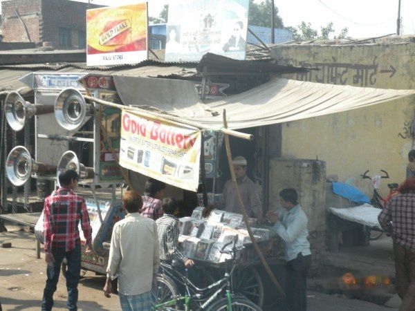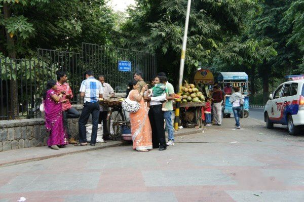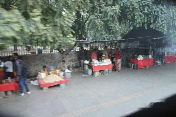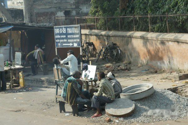 围墙外的缝衣店,一架缝衣车;单车修理店;流动的小贩、理发摊。这就是印度下层市民的生活来源。