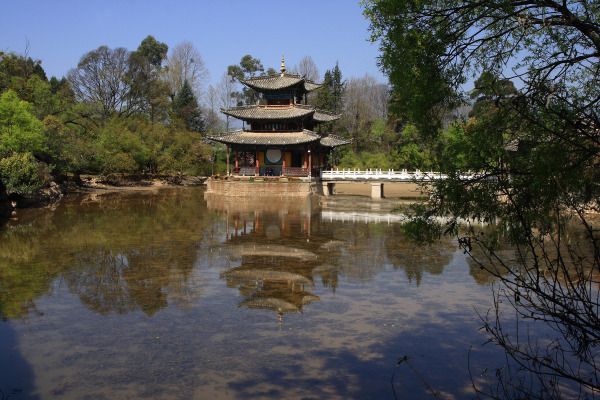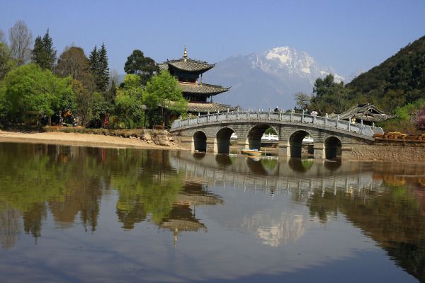 2012年春季自助游---云南丽江 续:【黑龙潭】位于大水车的北面,沿着玉河走廊逆流而上就看到了。它是丽江市的一个重点公园,之所以是重点,原因是黑龙潭的水是居民饮用水源之一。我们今年去的不是时候,大旱。潭还在,可是水没了,只剩一碗低水(有谁能想到今年下半年她哪又发大水了)。另一个原因是玉龙雪山的倒影映在黑龙潭上,风景很美。市民已经把这一景致看成是丽江市的标志,满大街跑的出租车都印有这一景致招贴画。如果早晨爬上”象山“,还能看到日出映照在”玉龙雪山“上的美景。不过这就看你的运气了。